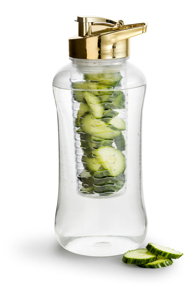 Denna tillbringare i plast har en mindre behållare för frukt inuti från Sagaform. Fresh tillbringare med fruktbehållare har en tjusig kork i mässing som ger en lyxigare känsla till designen. Perfekt att ha i kylen till sitt citronvatten.