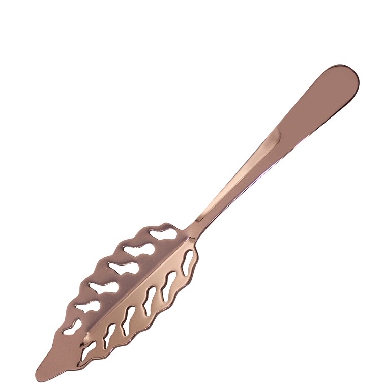 47 Ronin Absinthskje kobber. En eksklusiv, bladformet absint-skje i kobberfarge. En luksuriøs måte å nyte den klassiske spritdrikken Absinth sammen med en sukkerbit. La sukkerbiten sakte smelte mens du heller absint over den i skjeen. Hullene lar drikken renne ned glasset blandet med sukkeret.