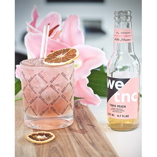 Fyll opp glasset med is, gin samt Swedish Tonic Water Peach.