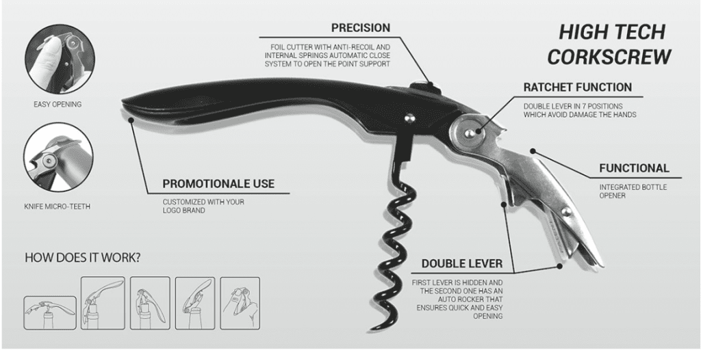 High Tech servitørkorketrekker i gull. En slitesterk og multifunksjonell vinåpner med integrert flaskeåpner. Metalldelen har to ledd og er enkel å bruke som støtte når du trekker opp korken. Denne modellen er litt snillere mot hånden når du trekker opp vinflaskene.