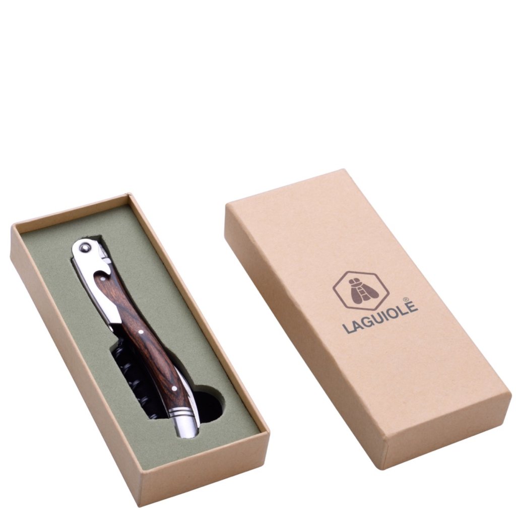 Laguiole servitørkorketrekker. En vakker servitøråpner av høyeste kvalitet. Denne stilige korketrekkeren har elegante treinnlegg, taggete kniv og teflonbelagt skrue.Leveres i en lekker gaveeske.