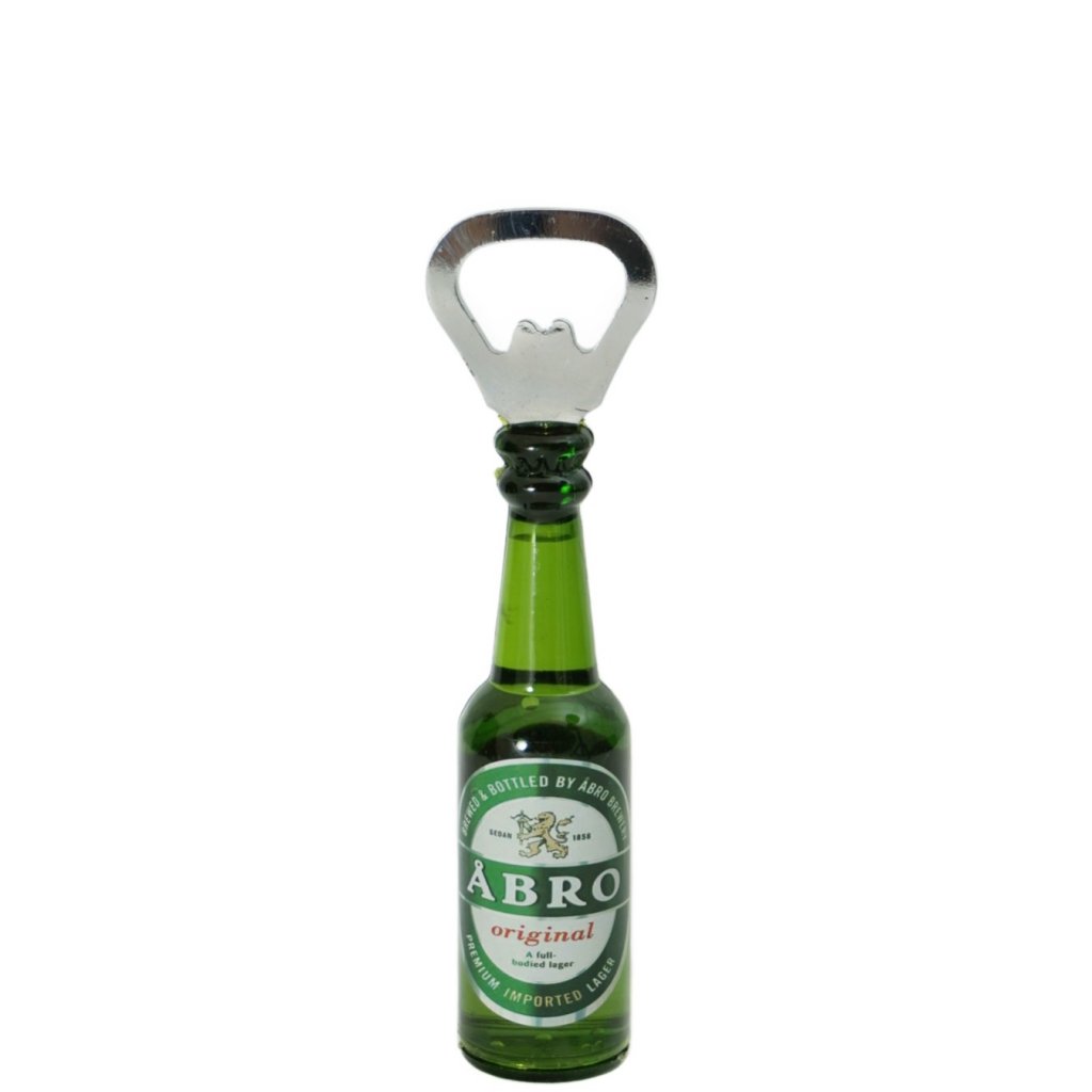 Magnetkapsylöppnare Åbro. En kapsylöppnare med Åbros logga på framsidan. Handtaget är utformat som en ölflaska och har en vätska inuti. Trivsam ölöppnare som har en magnet på baksidan för att kunna fästas på exempelvis ett kylskåp.Höjd: 13,7 cm