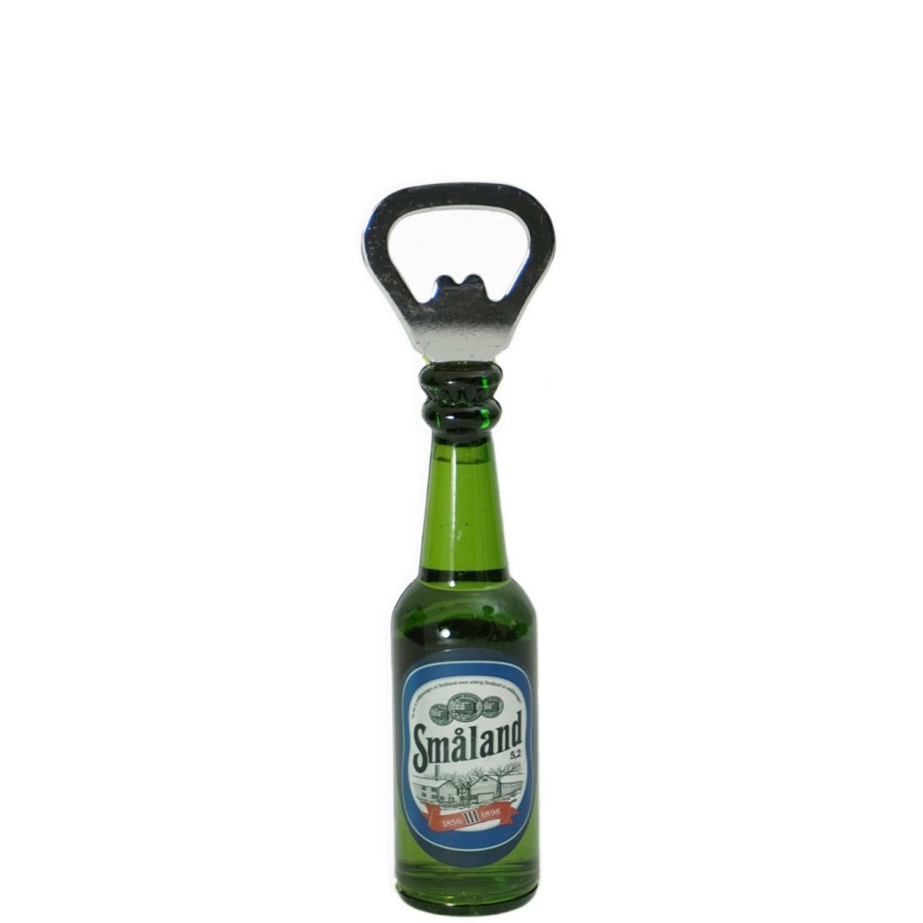 Magnetkapsylöppnare Smålands. En kapsylöppnare med Smålands logga på framsidan. Handtaget är utformat som en ölflaska och har en vätska inuti. Trivsam ölöppnare som har en magnet på baksidan för att kunna fästas på exempelvis ett kylskåp.