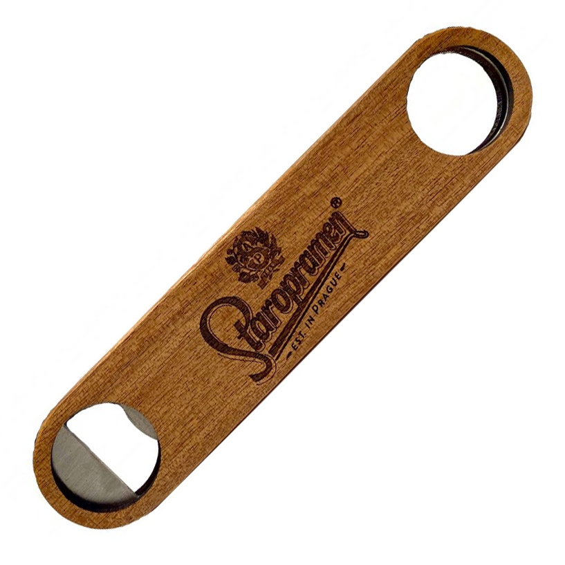 Staropramen Barblade kapselåpner i tre med Staropramen-logoen trykt på siden. En veldig fin og vakker ølåpner til å åpne ølen din med stil.Materiale: Tre og metall