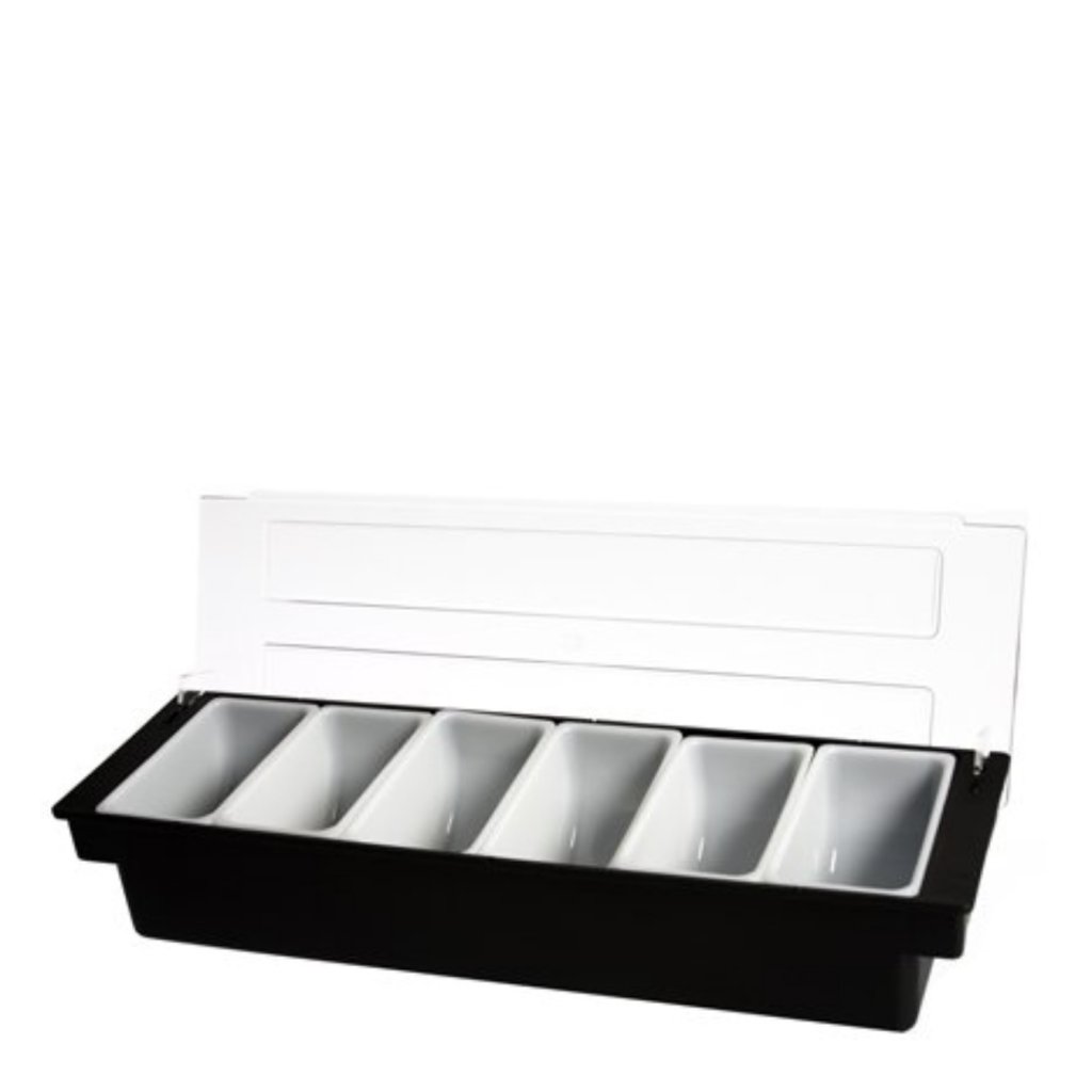 Cocktaildispenser med 6 rom i plast er en utmerket “mise en place”-oppbevaring for drinkingredienser. Denne modellen har seks rom og et plastlokk.