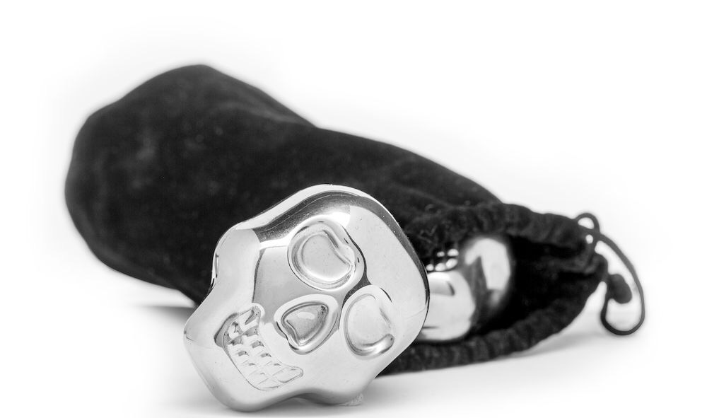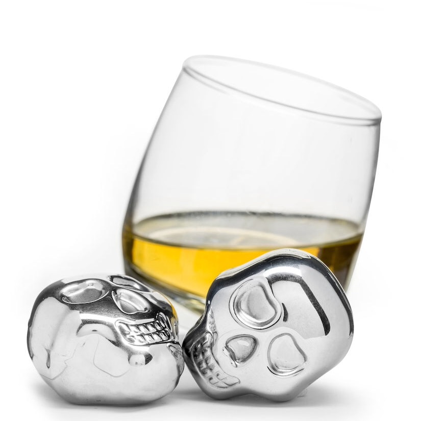Sagaform hodeskalleformede isbiter 2-pakning. Et par lekre isbiter i metall som holder drikken avkjølt uten å tynne den ut med vann. Disse hodeskalleformede isbitene legges i kjøleskapet 2 timer før bruk, og holder drikken avkjølt i lang tid. Leveres i en stilig sort oppbevaringspose.