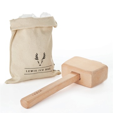 Trehammer med tilhørende ispose for å knuse is. En grov trehammer som med sin relative mykhet fungerer ypperlig til å knuse is.