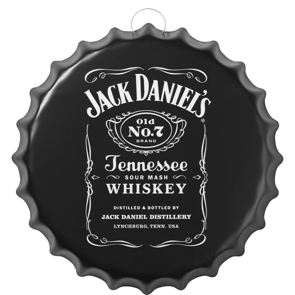 Väggskylt i metall, Jack Daniels. Snygg svart väggskylt formad som en kapsyl med Jack Daniels logga på. En stämningshöjande skylt till whiskyrummet eller hemmabaren.Ø: 40 cm