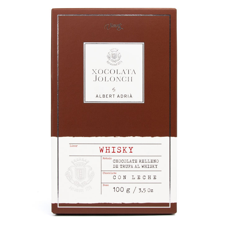 Jolonch by Albert Adrià - Mørk sjokolade med whiskytrøffel 100 gram, en smaksopplevelse utenom det vanlige. Oppdag den ultimate sjokoladegleden med Jolonch by Albert Adrià – mørk sjokolade i sin mest forførende form. Mellom to tynne lag med eksklusiv sjokolade skjuler det seg en jevn trøffel med whiskysmak. Denne unike fusjonen balanserer perfekt de dype tonene i sjokoladen og den rike karakteren til spriten, og skaper en smaksopplevelse som er både intens og sofistikert.