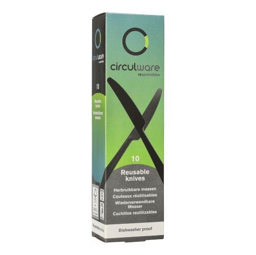 Kniv gjenbrukbar 19 cm 10-pakning laget av polypropylen og plantebasert plast som er 100 % resirkulerbar. Disse praktiske bestikkene er perfekte å ha med seg på tur, piknik eller til en passende fest innendørs eller utendørs.