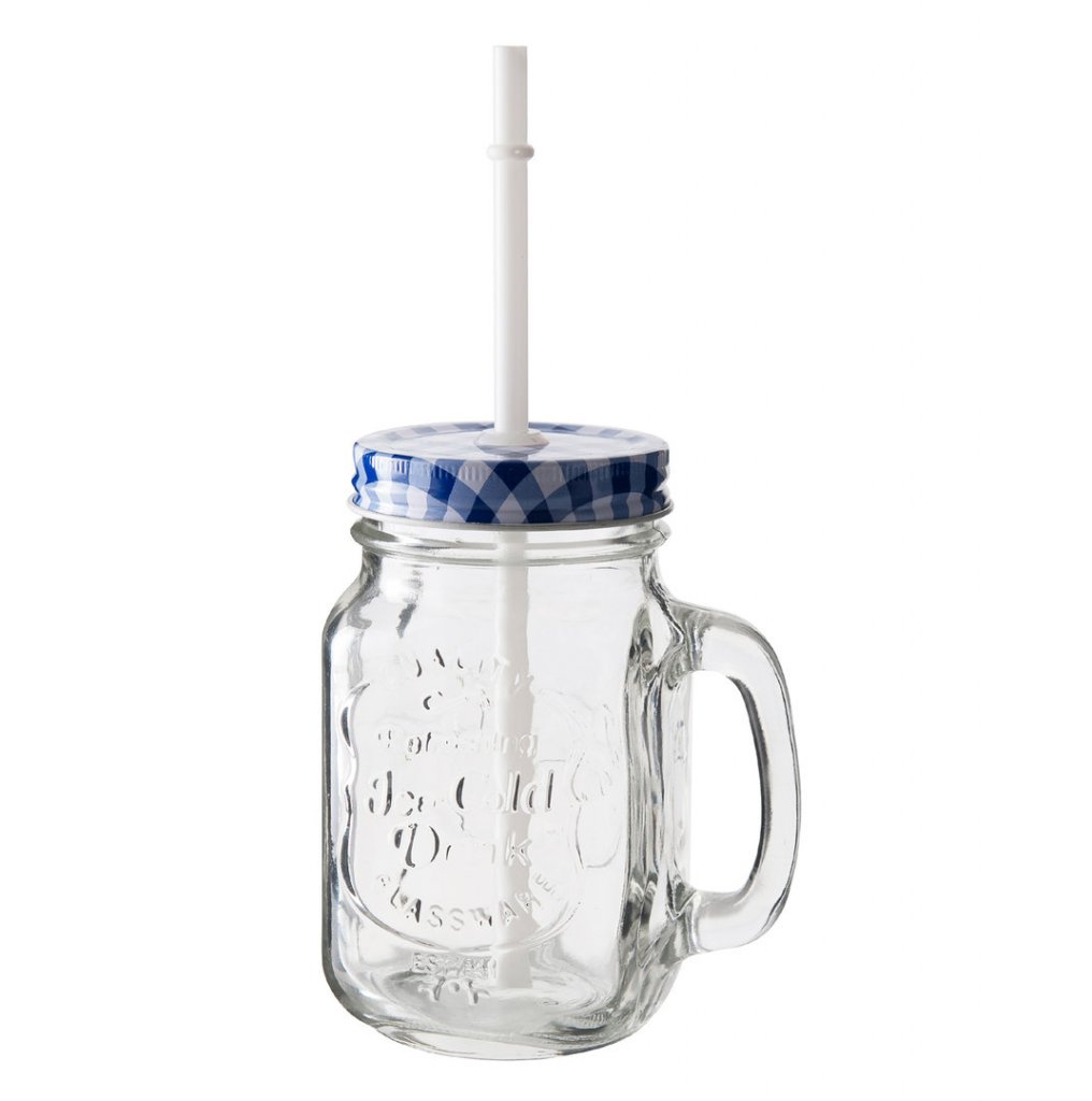 I leveransen ingår fyra rejäla glasbägare med blå-/vitrutiga skruvbara metallock samt vita sugrör i plast.