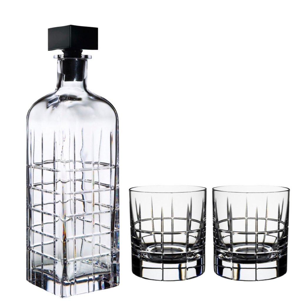 Street-pakken - 2 glass og 1 karaffel. Orrefors Street-serien ble designet av designeren Jan Johansson i 2006, med ambisjonen om å skape en karaffel med tydelige linjer som bringer tankene til moderne, urbane miljøer. Orrefors Street er en karaffel med klare kontraster og linjer. De svarte detaljer og det vertikale designet fører tankene til skyskrapere og høyt trafikkerte gater. En whiskykaraffel for alle som vil føle seg i sentrum. Sammen med sine stilige whiskyglass, er Street-serien en virkelig elegant kombo som unektelig løfter opplevelsen av innholdet.