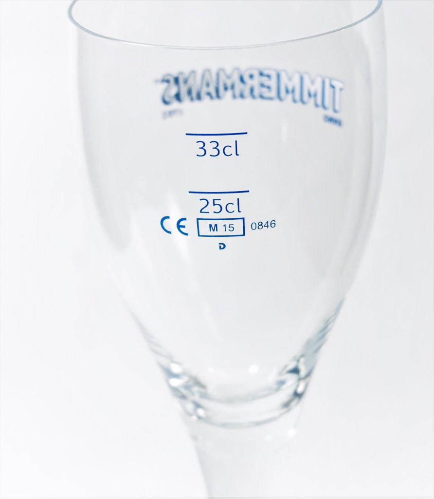 Timmermans ølglass Flute. Verdens eldste nåværende virksomme lambicbryggeri Timmermans produserer i hovedsak søte og cideraktige fruktlambicer. I den senere tiden har de imidlertid begynt å vende tilbake mot de mer tradisjonelle lambicanene. Denne typen glass er designet for fruktlambicer og hviler på en stabil stett. Selve kroppen er lett begerformet. Timmermans logo er trykt på forsiden av glasset. På baksiden er det 2 stk. kroningslinjer, ved 25 og 33 cl.