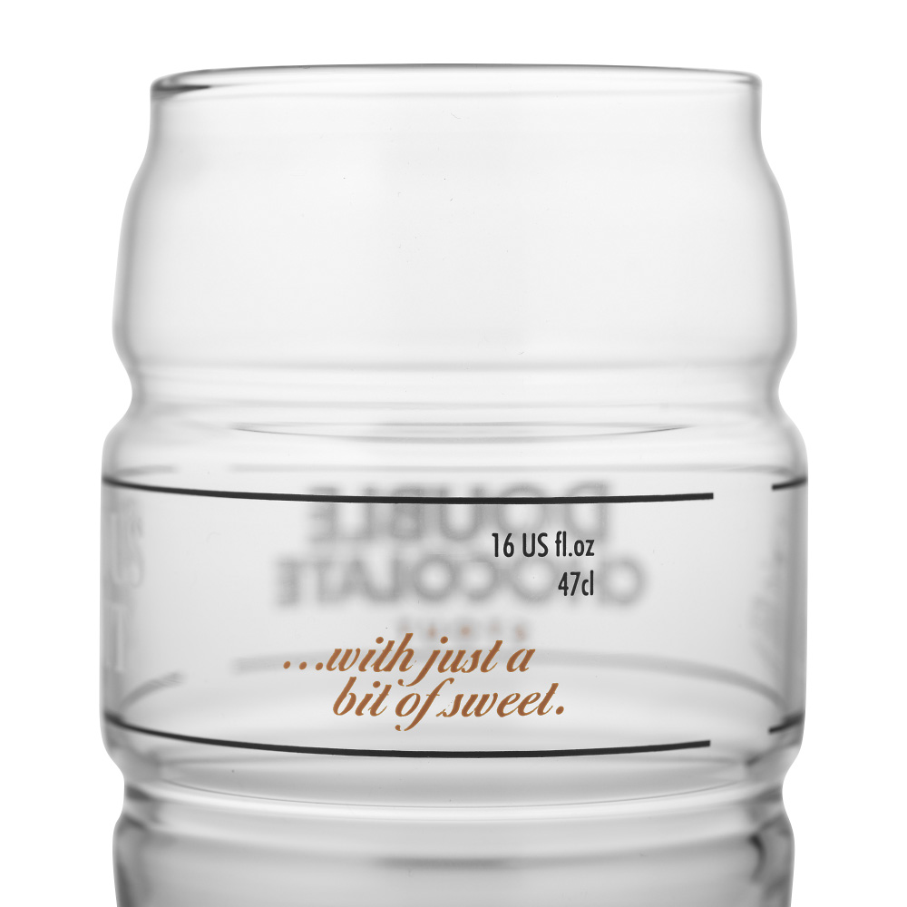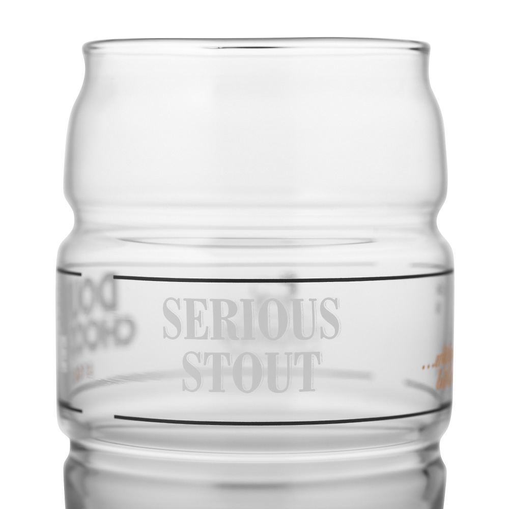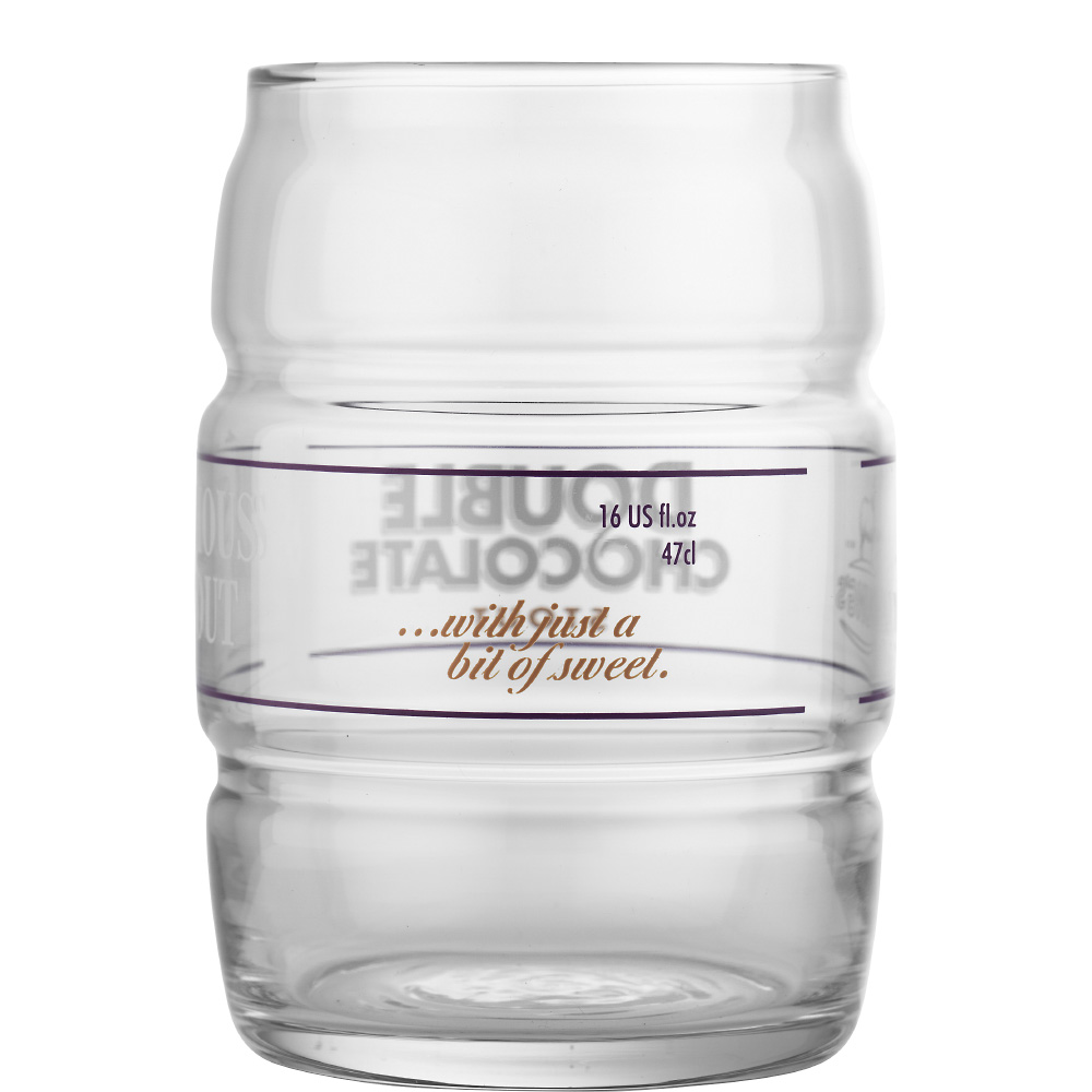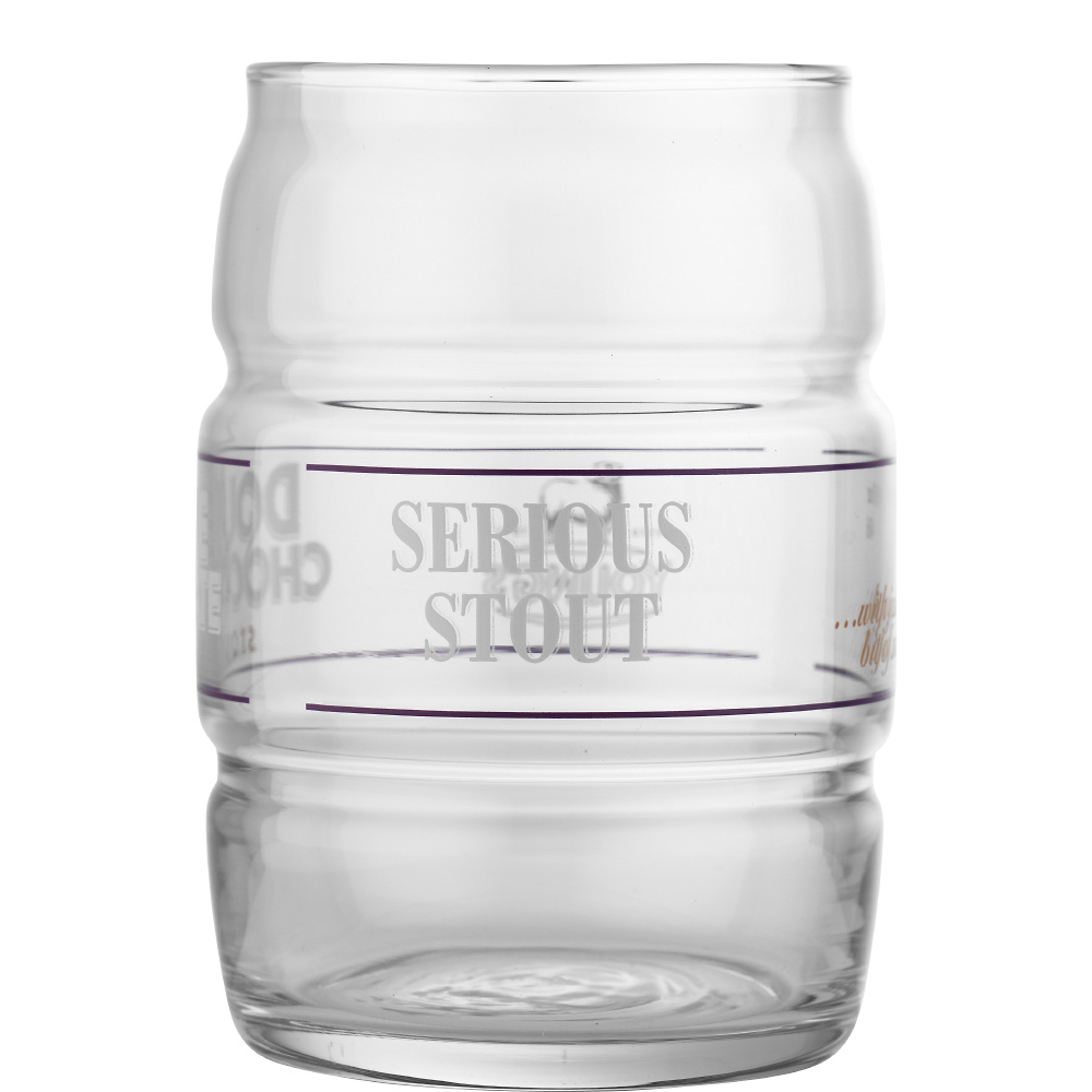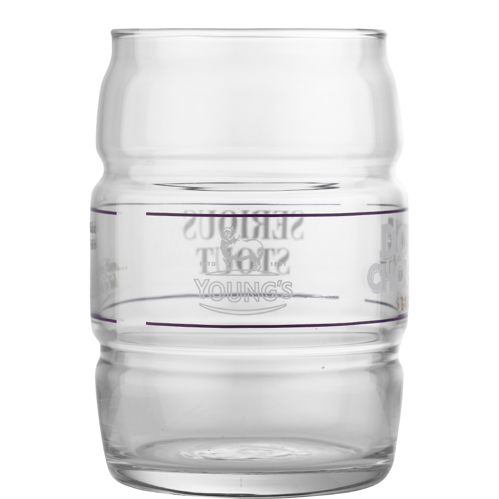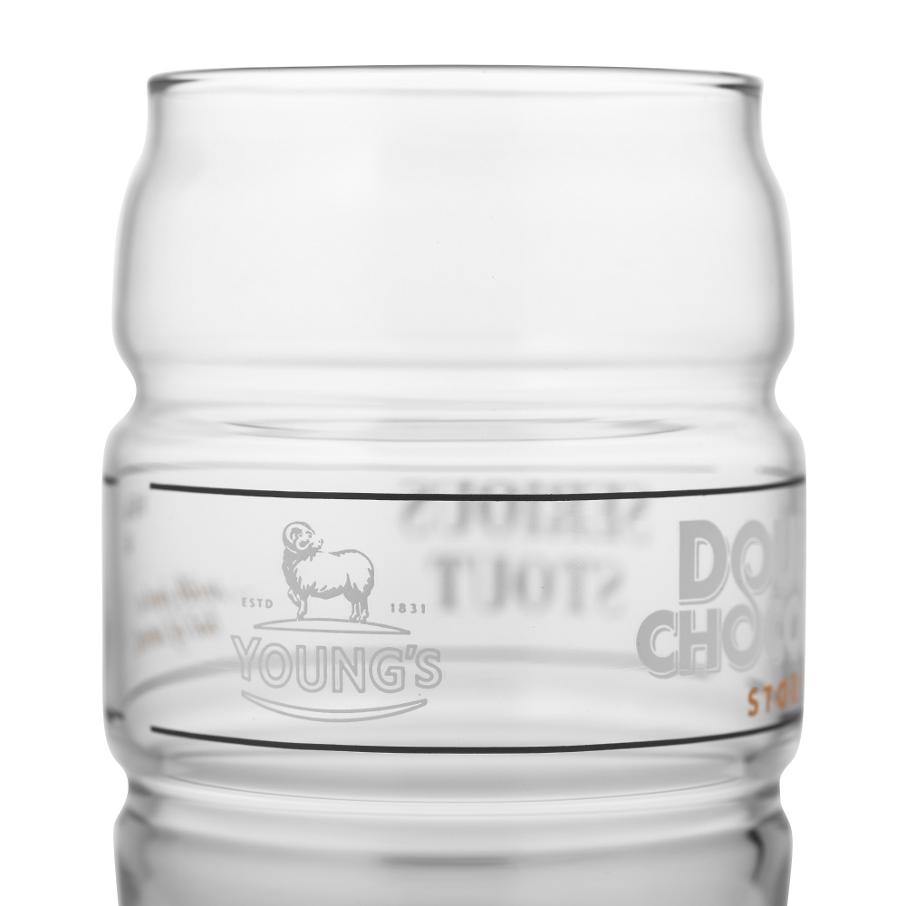 En mörk och mustig öl med tydliga toner av choklad. Youngs Double Chocolate Stout har både chokladmalt och mörk chokladessens i sig vilket ger denna öl en robust och fyllig smak trots till förhållandevis låga alkoholhalt. Detta ölglas har en helt unik design. Glaset är utformat som ett ölfat som ofta används vid servering av Real Ale, vilket är den huvudsakliga typen av öl som Young's Brewery tillverkar, även om vi sällan ser den i Sverige. Runt glaset finns de olika trycken Double Chocolate Stout, Serious Stout, With just a bit of sweet och Young's Brewery på respektive sida.
