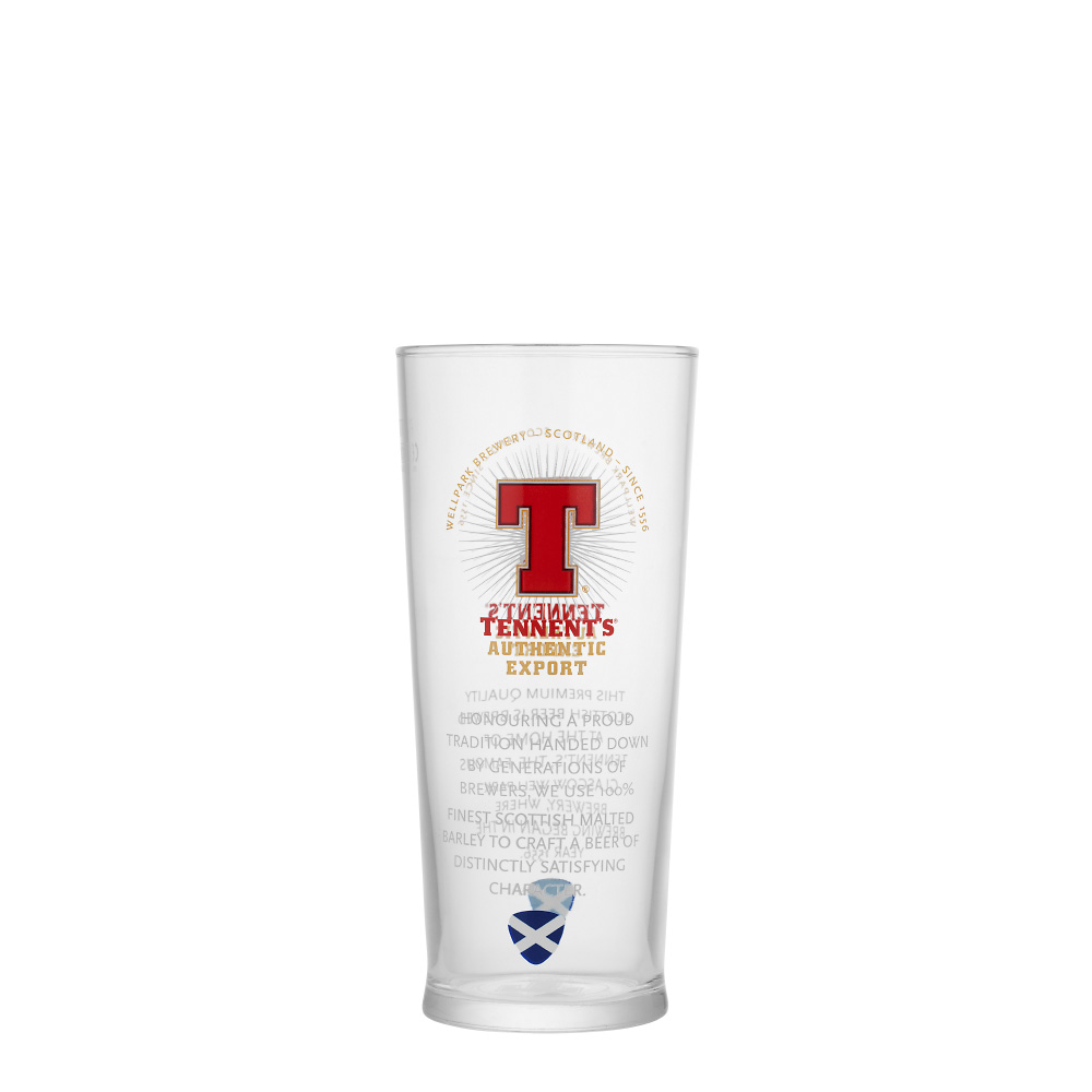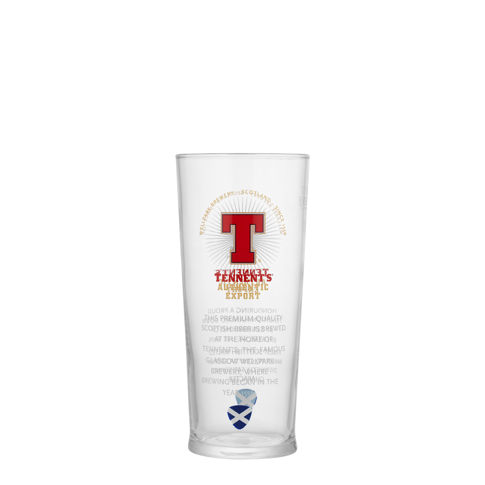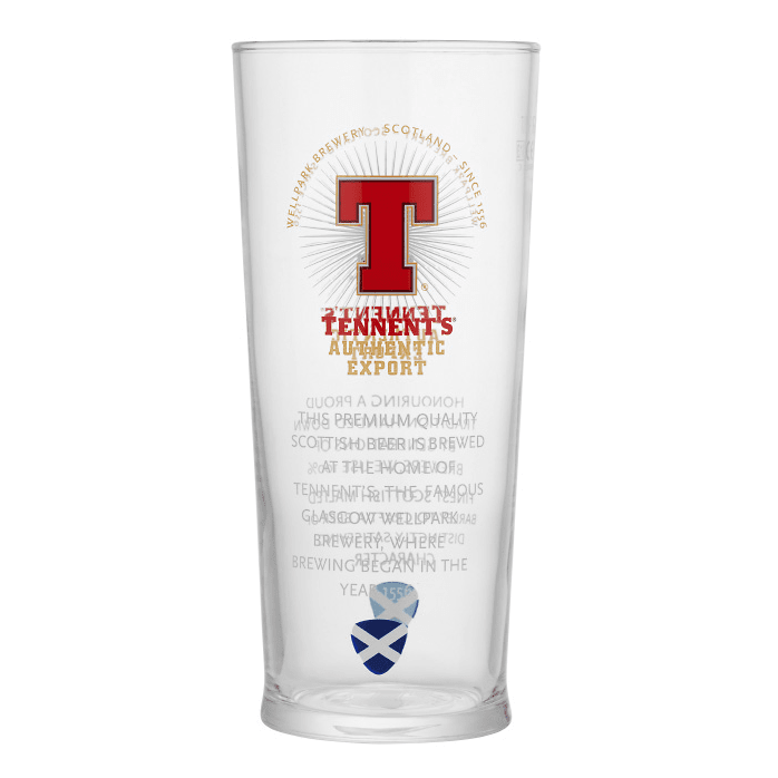 Tennents ølglass 50 cl. Tennent's er Storbritannias første lager, med aner fra 1556. Dette ølglasset har Tennents logo på begge sider. På den ene siden står teksten "Hounouring a proud tradition handed down by generations of brewers, we use 100% finest Scottish malted barley to craft a beer of distinctly satisfying character".