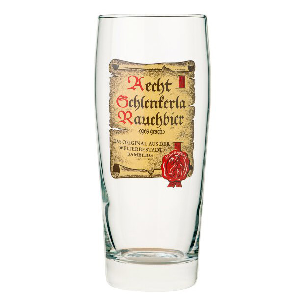 Aecht Schlenkerla Rauchbier ølglass 25 cl. Det klassiske tyske bryggeriet fra Bamberg i Bayern dateres tilbake til 1600-tallet. Aecht Schlenkerla steker malten i egne ovner over åpen ild, noe som gir den unike røykfylte karakteren til deres pilsnerøl. Selvfølgelig skal dette ølet serveres i sitt riktige ølglass. Dette ølglasset har et rett og klart design. På forsiden er den berømte logoen som ligner et pergament trykt.