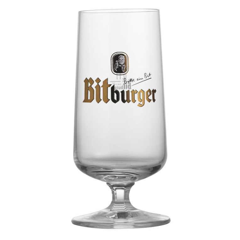 Bitburger ølglass 10 cl. Bitburger profilglass i delikat format der glasset hviler på en stilig fot. Glasset i seg selv er relativt tynt og formen har en lett avsmalning hvis hensikt er å bevare aromaene i ølglasset. Bitburger-logoen er trykt på forsiden.