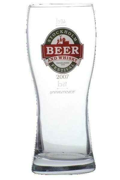 Detta historiska glas har kröningslinje vid 15 cl och 40 cl. Märkt med Stockholm Beer and Whisky Festivals logga.