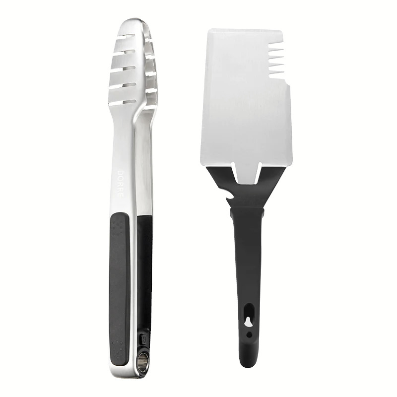 BBQ grillsett med grilltang og stekespade er stilig utformet i rustfritt stål med gummierte håndtak. Slitasjebestandig grillsett som letter grillen.