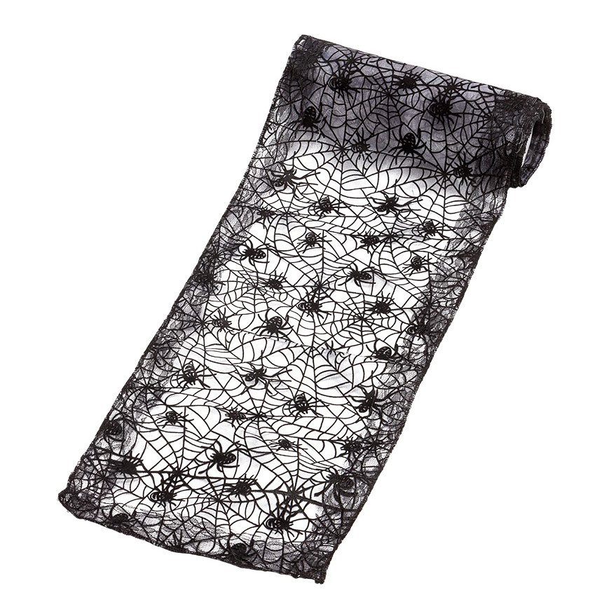 Halloween bordløper i sort med edderkoppmotiver som passer perfekt til å dekke på med til Halloween-festen. Løperen har 2 lag der det nederste er helt hvitt og det øverste er sort.