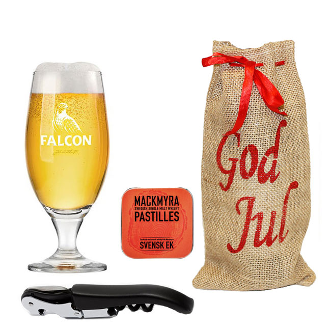Sekkevevd julepose med rødt bånd som inneholder en kapselåpner, Mackmyrapastiller og et elegant Falconølglass. En perfekt gavepakke, allerede pakket inn i juleposen. Veldig godt egnet julegave til alle som elsker Falcon og smakfulle snacks.