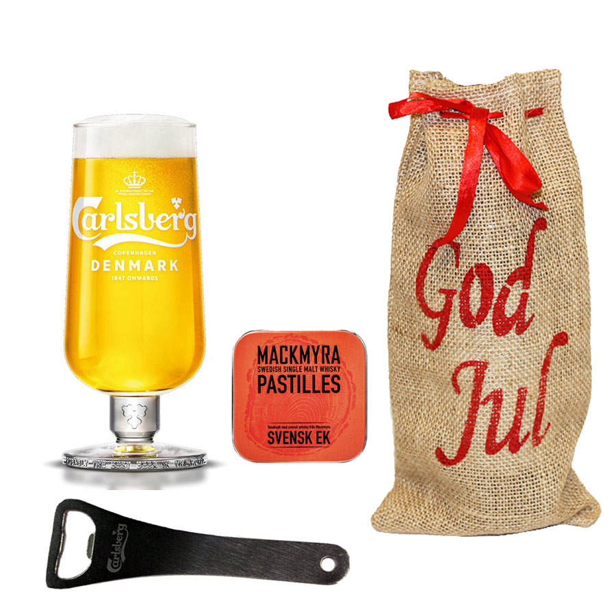 Julepose i strie med rødt bånd som inneholder en Carlsberg kapselåpner, pastiller fra Mackmyra og et elegant ølglass fra Carlsberg i deres nye glasserie. En perfekt gavepakke, allerede pakket inn i juleposen. Veldig godt egnet julegave til alle som elsker Carlsberg og velsmakende snacks.
