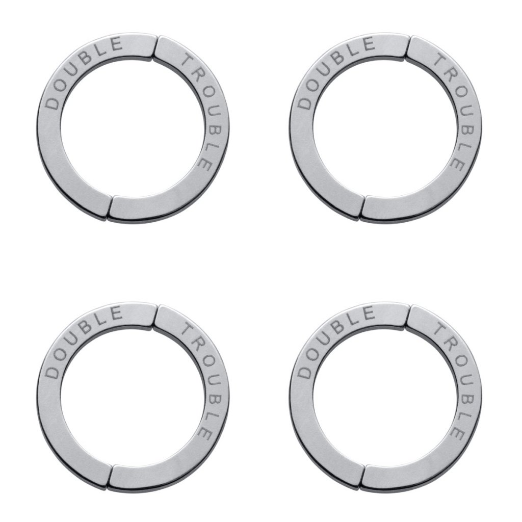 Hvert sett inneholder fire magnetiske ringer lasergravert med teksten "Double Trouble" - perfekt for å feste rundt bunnen av GT-brillene dine eller andre briller på føttene. De magnetiske ringene er en vakker detalj til ethvert glass og er designet for å enkelt klikkes på plass og fjernes uten å skade glasset.
