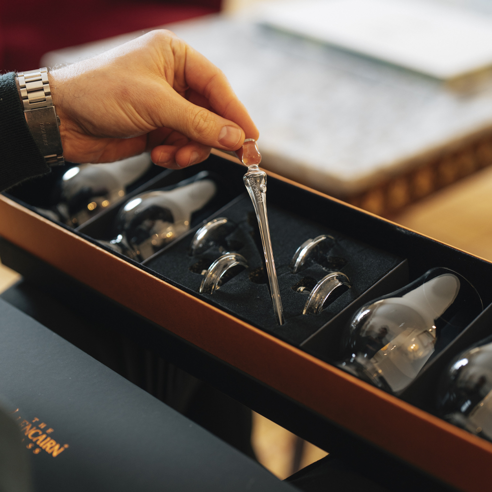 - 1 munnblåst Glencairn-glasspipette – for presis dosering av vann for å åpne whiskyens karakter